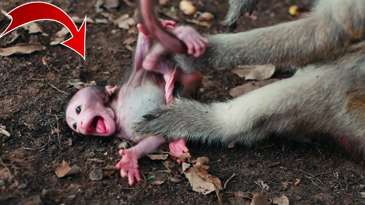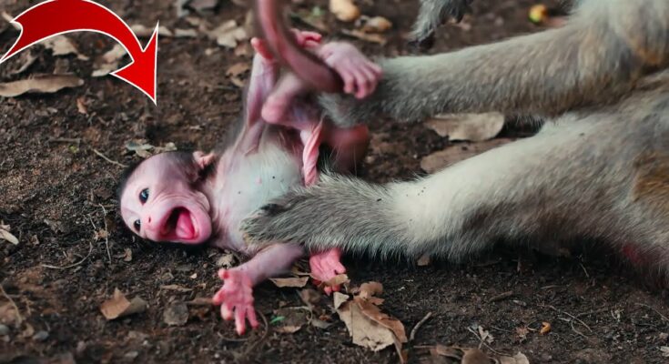 The jungle was quiet that morning, the golden light of dawn filtering softly through the trees. High above, a mother monkey was in labor, her body trembling as she brought new life into the world. Moments later, a tiny, fragile baby monkey was born—pink, wet, and shivering, still too weak to move. The mother held her newborn close, licking its tiny body clean and trying to steady herself on the thin, swaying branches. But the birth had drained her strength, and tragedy struck in an instant.